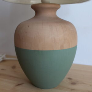 Lampe en bois tourné, peinte et vernie. Abat-jour en coton épais blanc cassé de diamètre 20cm.